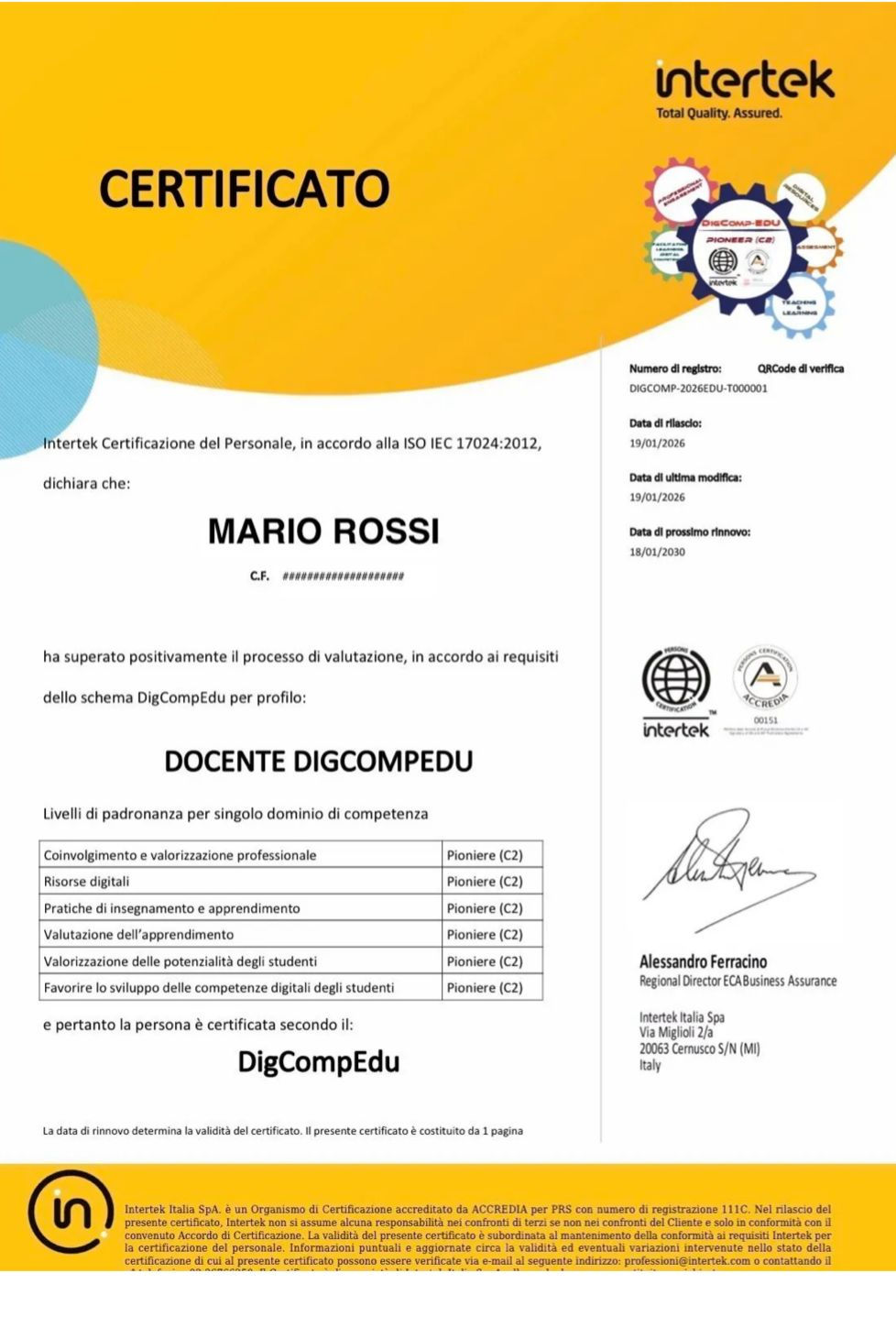 Attestato di certificazione DigCompEdu Accreditato Accredia By Intertek